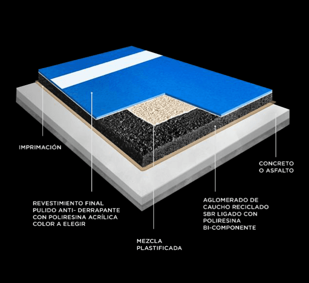 Sistema Amortiguante Outdoor. Nivel Alta competición y Recreativo. Superficie monolítica pulida anti-derrapante, hecho in situ. Máxima clase anti-incendios deportivos BFL-S1. Absorción de impacto y retorno de energía en 11mm (32%), 13mm (33%) y 15mm (39%) bajo la norma europea en materia de deportes UNE-EN 14808. Elaboración base de imprimación, aglomerado de caucho SBR negro, resinas aglutinantes bi- componentes de poliuretano, capas de mezclas plastificadas y revestimiento final de tracción con poliresinas acrílicas en color a elegir. Certificación: NCK.2019.139.ISO9001.H104. Ideal en Ludotecas, Kinders, Escuelas y Áreas infantiles. ESPESORES: 11MM. / 13MM. / 15MM.