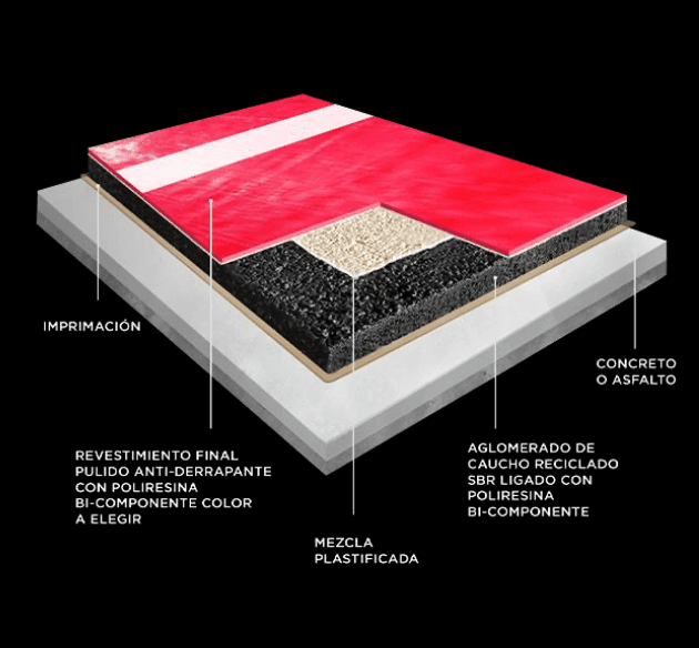 Sistema Amortiguante Indoor. Nivel Alta competición y Recreativo. Superficie monolítica pulida anti-derrapante, hecho in situ. Máxima clase anti-incendios deportivos BFL-S1. Absorción de impacto y retorno de energía en 11mm (32%), 13mm (33%) y 15mm (39%) bajo la norma europea en materia de deportes UNE-EN 14808. Elaboración base de imprimación, aglomerado de caucho SBR negro, resinas aglutinantes bi- componentes de poliuretano, capas de mezclas plastificadas y revestimiento final de tracción con poliuretano en color a elegir. Certificación: NCK.2019.139.ISO9001.H104. Ideal en Ludotecas, Kinders, Escuelas y Áreas infantiles. ESPESORES: 11MM. / 13MM. / 15MM.