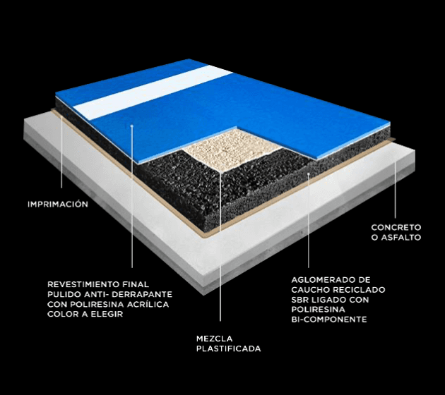 Sistema Amortiguante Outdoor. Nivel Alta competición y Recreativo. Superficie monolítica pulida anti-derrapante, hecho in situ. Máxima clase anti-incendios deportivos BFL-S1. Absorción de impacto y retorno de energía en 11mm (32%), 13mm (33%) y 15mm (39%) bajo la norma europea en materia de deportes UNE-EN 14808. Elaboración base de imprimación, aglomerado de caucho SBR negro, resinas aglutinantes bi- componentes de poliuretano, capas de mezclas plastificadas y revestimiento final de tracción con poliresinas acrílicas en color a elegir. Certificación: NCK.2019.139.ISO9001.H104. Ideal en Auditorios, Polideportivos, Plazas comerciales y Campus. ESPESORES: 11MM. / 13MM. / 15MM.